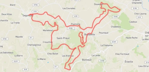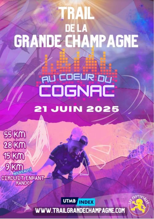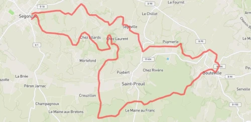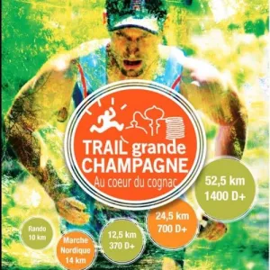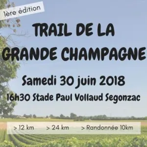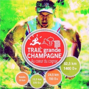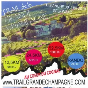 TRAIL DE LA GRANDE CHAMPAGNE,départ du stade Paul VOLLAUD,pour dévaster les coteaux de Segonzac et prendre la direction des bois de ST PREUIL pour aller admirer la vue dégagée sur cognac,barbezieux,angouleme et le vignoble du haut de la table d'orientation,chemin,vigne,passage sur les crêtes pour rentrer sur Segonzac.
