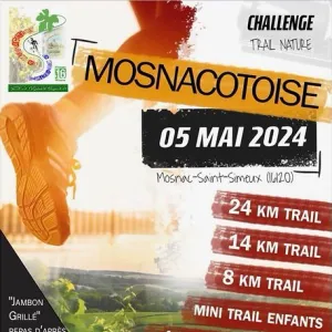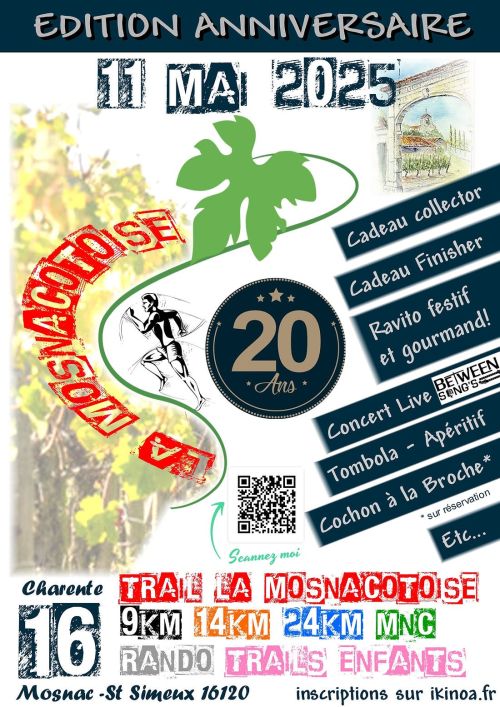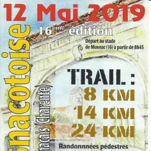 La Mosnacotoise, Trail du Vignoble Cognaçais. Pour cette édition dans notre petit coin de Charente, vous traverserez campagne, vignes, sous-bois, distillerie, ruines de vieux moulin, et vous pourrez contempler lavoirs, écluses, pêcheries, points de vue sur la vallée du fleuve Charente. Avec notre cadeau de bienvenu, les récompenses sportives, les lots du tirage au sort et la visite de fermes productrices vous dégusterez nos produits régionaux.