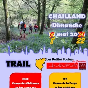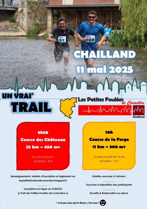 Les Petites Foulées de Caractère vous invitent à découvrir le territoire de Chailland (53), village labellisé Petite Cité de Caractère, et son patrimoine historique, architectural et paysager : forêt, rivière, bosquets, bocage, châteaux, moulins, lavoirs, chapelles et panoramas sont au programme ! Catégories autorisées ES->V5.