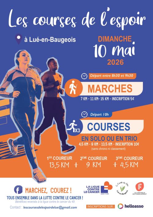 Inscription en ligne sur : https://www.helloasso.com/associations/comite-49-ligue-contre-le-cancer/evenements/les-courses-de-l-espoir-lue-en-baugeois-2026
