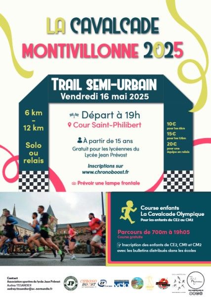 La Cavalcade de Montivilliers est une course trail semi-urbain de 6 km (une boucle) ou 12km (deux boucles) individuelle ou par équipe de deux.
