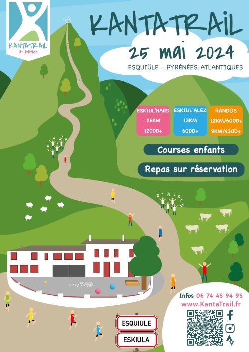 📅 Bloquez votre samedi 17 mai 2025, 🏃 le KantaTrail revient à Esquiüle pour une quatrième édition ! ⛰️ Tout au long des parcours, vous pourrez profiter des magnifiques panoramas sur la chaîne des Pyrénées 🤩 et de l'ambiance apportée par nos groupes de chanteurs 🗣️🎶. On conserve bien sûr la formule qui a fait le succès de la première édition du KantaTrail, tout en l’améliorant. Les parcours seront sensiblement les mêmes avec quelques améliorations et surprises supplémentaires !