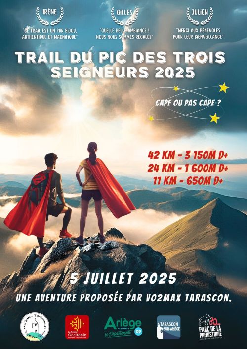 • TRAIL DE LA COURBIERE : 11 km, 650m d+ • TRAIL DE DE L’ETANG D’ARTAX : 24 km, 1 600m d+ Espoirs à Master Le temps maximum pour réaliser le parcours est fixé à 6h30 demandant une bonne forme physique. • MARATHON DU PIC DES TROIS SEIGNEURS : 42 km, 3150m d+, Parcours engagé, comportant des passages techniques bonne forme physique. Épreuve chronométrée, ouverte aux catégories Espoir à Master. Le temps maximum pour réaliser le parcours est fixé à 12h.