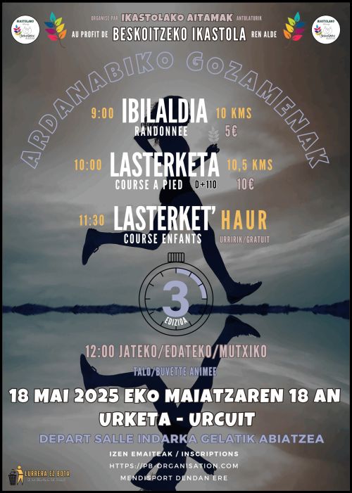 Matinée sportive en faveur de l’ikastola organisée par l’association Aitamak, se déroulant à Urcuit autour du parcours de l’Ardanav. Parcours se situant aux croisements des villages de Briscous, Urcuit et Urt dont beaucoup d‘enfants fréquentent l’ikastola de Briscous.