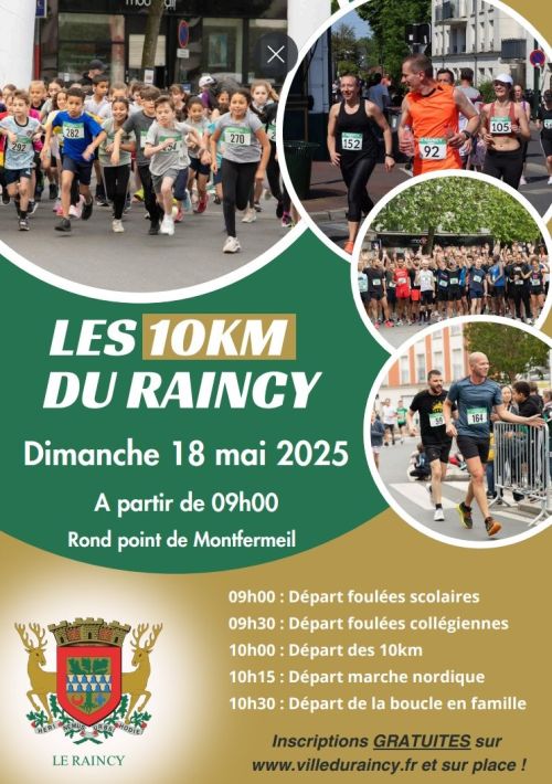 L'INSCRIPTION EST OBLIGATOIRE La manifestation des 10 kilomètres est organisée par le service des sports de la ville du Raincy. Le lieu de rendez-vous est le Rond Point de Montfermeil 93340 Le Raincy. Le siège de l’organisation est situé à l’Hôtel de Ville 121 avenue de la Résistance-93340 LE RAINCY. Les épreuves sont ouvertes aux athlètes licenciés aux Fédérations Françaises d’Athlétisme et de Triathlon et non licenciés de toutes nationalités. Une autorisation parentale est obligatoire pour les mineurs.
