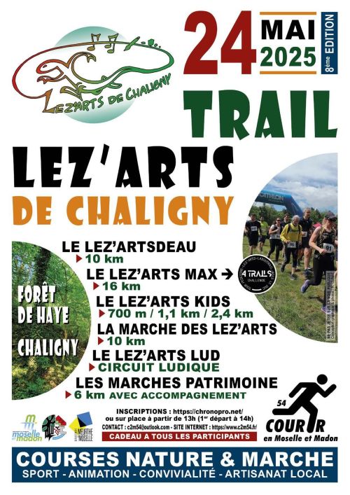 Trail dans la Forêt de Haye sur les hauteurs de Chaligny Le Lez'Artsdeau (10km) ou Le Lez'Arts Max (16km) ou les Lez'Art Kids (700m, 1,1km et 2,4km, ) ou la marche des Lez'Arts (10km) ou les marches Patrimoines (5km) Courses Nature & Marche Sport, convivialité, musique et compositions artistiques