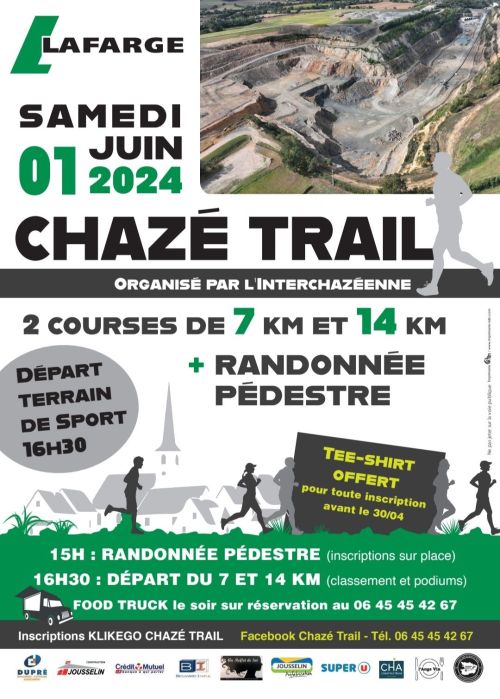 Le Chazé Trail est une course nature conviviale qui se déroule à Ombrée d'Anjou, en Maine-et-Loire, sur le site de Chazé-Henry. Le parcours emprunte des chemins, des sentiers forestiers, le tour d’un étang et traverse notamment la carrière Lafarge, offrant un cadre varié entre nature et passages atypiques. Avec des distances accessibles (environ 8 km et 15 km), c’est une belle occasion de courir en soirée, de se dépasser et de partager un moment sportif simple et chaleureux entre coureurs.