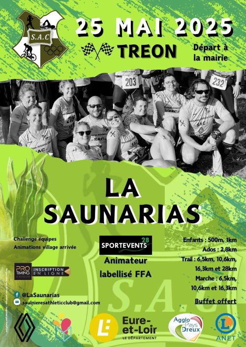 Le village arrivée de la Saunarias vous proposera cette année encore de nombreuses animations: structures gonflables, laser game, jeux en bois, bormes arcades, mni-enquêtes à réaliser, challenge biathlon optique, stand running / trail /marche nordique, pôle bien-être avec massage. La matinée sera animée par Sportevent28, avec un amnimateur labellisé FFA. Le groupe Chris and the Jacks viendra quant à lui animer la scène de Tréon pour vous faire profiter pleinement de cette matinée sportive et culturelle. Enfin, la Saunarias, ce n'est pas un simple ravito de fin de course. Nous vous proposons en plus de vous offrir un véritable buffet en fin de matinée, après les courses enfants.