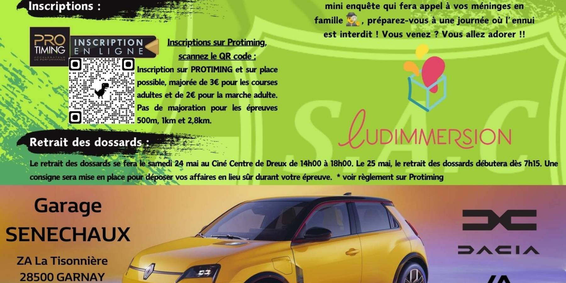 Le retrait des dossards se fera le samedi 24 mai 2025 au Ciné Centre de Dreux de 14h00 à 18h00. Le 25 mai, les dossards pourront être retirés dès 7h15 à la salle communale de Tréon. Les inscriptions seront également possibles sur place avec une majoration tarifaire sauf pour les courses enfants et la marche. Une consigne sera mise en place pour déposer les affaires en lieu sûr durant les épreuves. Les parents pourront accompagner les plus jeunes enfants dans leur course : les jeunes auront ainsi la joie de partager cette épreuve sportive avec leurs parents.