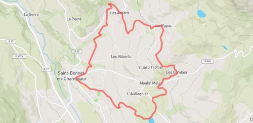 Description : course empruntant en quasi-totalité des sentiers de randonnée et des chemins forestiers, passant par le Lac de l’Aulagnier, les hameaux de l’Aulagnier, les Combes, les Payas, le Lac de Barbeyroux, les Infournas Hauts, Charbillac, Pisançon, les Gentillons et revenant à St Bonnet.
