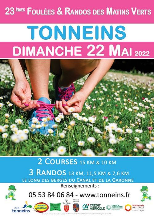 La ville de Tonneins organise la course et marche pédestre des Foulées des Matins Verts. Cette manifestation, devenue incontournable dans le département, génère chaque année, plus d’un millier de coureurs et marcheurs. Elle se déroule dans une ambiance festive et conviviale, le long de la voie verte en bordure du canal. Elle est ouverte à tous. Des stands gastronomiques sont proposés tout au long du parcours et des groupes musicaux sont présents pour assurer l’ambiance et motiver chacun des participants.