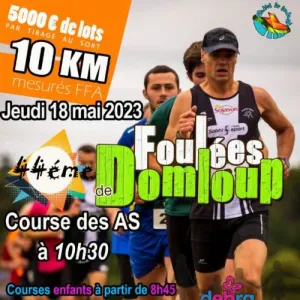 Foulées de Domloup. Le départ de la Course des As sera donné à 10H30. Le parcours avec de nombreuses relances, emprunte les chemins pédestres de Domloup ainsi que la Vallée du Rimon (50% Chemin 50% Route).