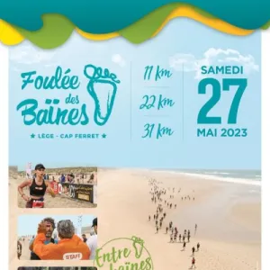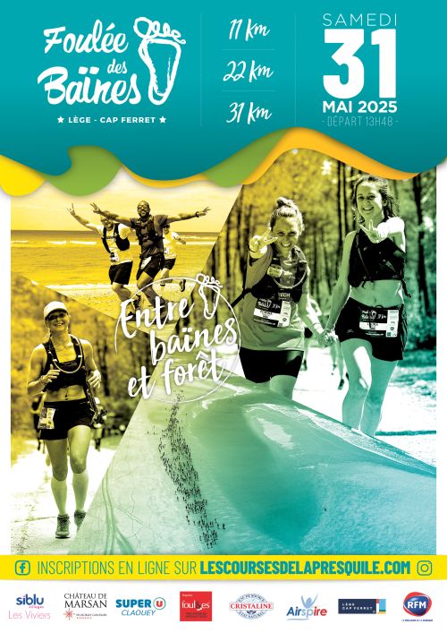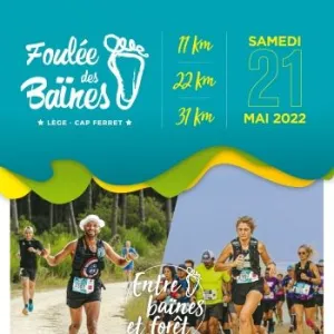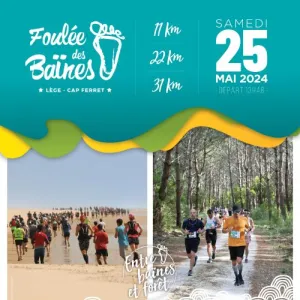 La Foulée des BaÏnes c'est 50 % sable - 50 % Forêt. Départ à 30 minutes de la marée Basse avec un seul ravitaillement à mi-parcours. Tour de cou et bouteille de vin à tous les inscrits.