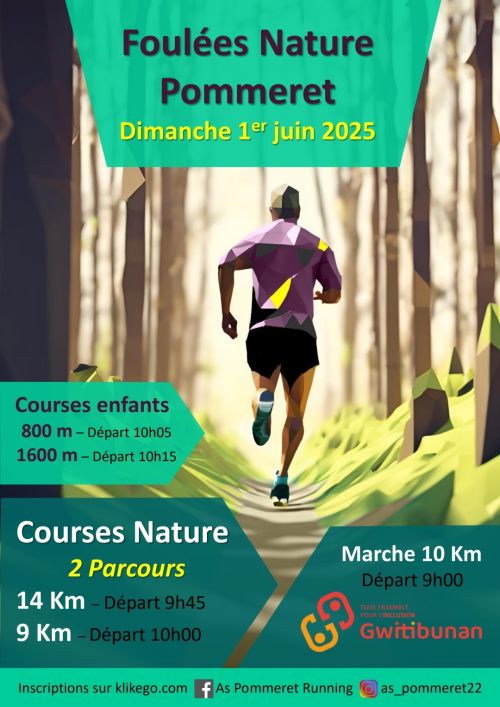 Les Foulées Nature de Pommeret sont une course à pied en pleine nature, organisée dans la commune de Pommeret, située en Côtes-d'Armor, en Bretagne. Au départ de la salle omnisports, les parcours de 9 km et 14 km traversent sentiers et paysages locaux, avec des options pour enfants et une randonnée solidaire. Rejoignez cet événement convivial pour allier sport et découverte du patrimoine breton, et partager un moment simple avec d'autres coureurs.
