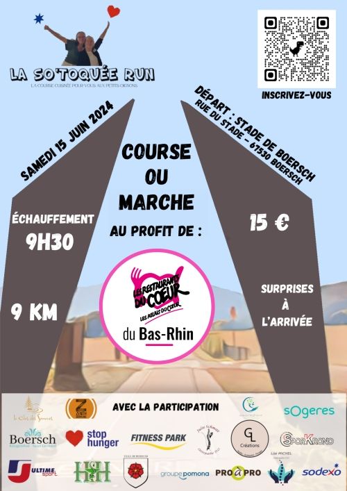 La So'Toquée Run est un événement caritatif au profit des Restaurants du Coeur. La course chronométrée et la marche reprennent le même parcours sur 9km. Un ravitaillement est prévu à mi parcours, prévoyez une casquette, le soleil sera convié ! Le retrait des dossards est prévu le jour j dès 8H au gymnase de Boersch Rue du Stade Un échauffement tonifiant sera proposé aux participants à 9H30 10H départ de la course, 10H10 départ de la marche Des bénévoles seront là pour vous indiquer le chemin, restez avec nous après la course de nombreuses suprises vous attendent !