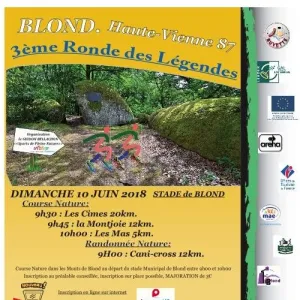 Découverte des sentiers et pierres à légendes des Monts de Blond Nouveaux parcours. Pot de l'amitié à l'arrivée, buvette, restauration rapide Parking proche, vestiaires, douche au stade de Blond