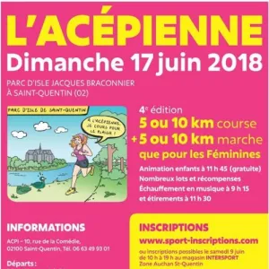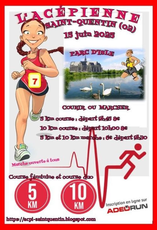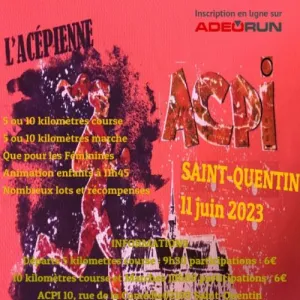 l'ACPI organisera au Parc d'Isle de Saint-Quentin un "5 et un 10 kilomètres" destinés aux femmes avec possibilité de courir en couple. Deux courses, deux marches organisées par les ACPIens ! Mesdames, mesdemoiselles, réservez d'ores et déjà cette date dans votre agenda sportif.