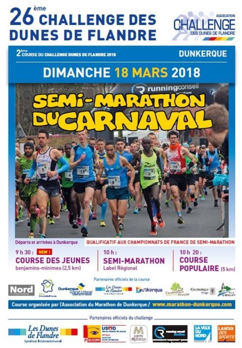 Semi-Marathon du Carnaval avec Trois courses : Une course de 1800m ouverte pour les benjamins (1 tour) et les minimes 3400m (2 tours), Un Semi-marathon départ à 10h00, Un 5kms départ à 10h20. Remise des prix en extérieurs (courses des jeunes) sur le podium du car de la Voix Du Nord à 11h45