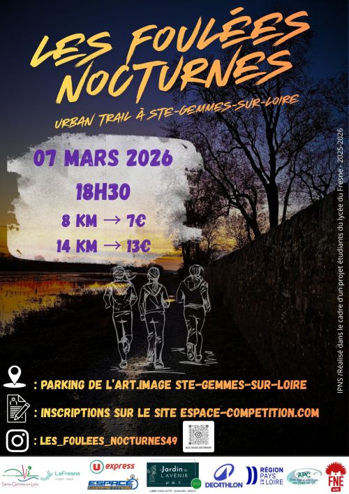 Les Foulées Nocturnes sont une course à pied nocturne qui se déroule à Sainte-Gemmes-sur-Loire. Organisée par les étudiants en BTS aménagement paysager du Lycée du Fresne, elle propose deux parcours : 8 km et 14 km, avec départ en soirée et frontale obligatoire pour les participants. L'événement se tient dans un cadre local calme, au bord de la Loire, sur des chemins et sentiers qui permettent de courir dans l'obscurité, avec une ambiance particulière liée à la nuit.