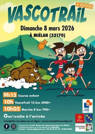 Le petit Musée des Sapeurs Pompiers de Miélan organisent pour la quatrième fois son VascoTrail dans l'Astarac, avec un parcours sauvage, rustique et casse-patte. Des singles, chemins forestiers, hors sentier, passage de ruisseaux, gros raidards, longs faux plats montants, bref… vous serez servis !! Une collation d'après course "Gas croûte" est proposée pour vous requinquer. Une marche conviviale est également proposée ainsi qu'une course enfant pour les pitchouns.