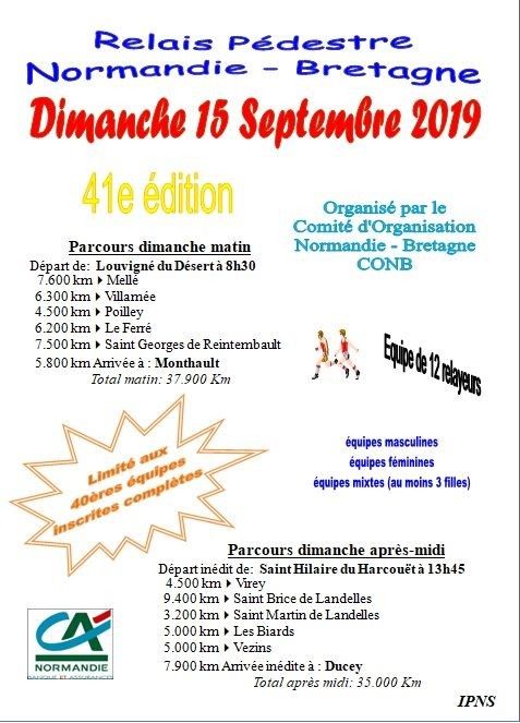 Relais Normandie Bretagne. Partie le matin de Louvigné-du-Dézert, la course par relais fera étape le midi à Saint-Hilaire-du-Harcouët. Puis cap vers Ducey au bout des 75 km proposés.