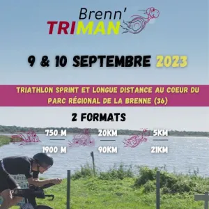 Le Brenn'Triman est un triathlon organisé à Le Blanc, dans l'Indre, au cœur du Centre-Val de Loire. Les parcours traversent la région de la Brenne, surnommée le "Pays des Mille Étangs", offrant des paysages paisibles de lacs, de prairies et de nature préservée. Avec des distances variées (XS, S, M, L), en solo ou en relais, cet événement convient à tous les niveaux. Venez relever le défi et découvrir la beauté de la Brenne !