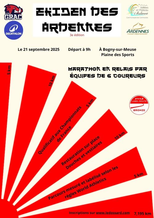 L’Ekiden des Ardennes est un relais effectué par 6 coureurs sur la distance du marathon, soit 42,195km.
