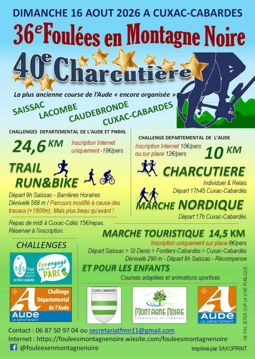 Foulées en Montagne Noire. Journée sportive et conviviale au cœur de la Montagne Noire avec marche touristique, marche nordique, courses à pied et Run&Bike de 24,6 km et 10 km. Animation enfants organisée pendant les fêtes du village de Cuxac-Cabardes.