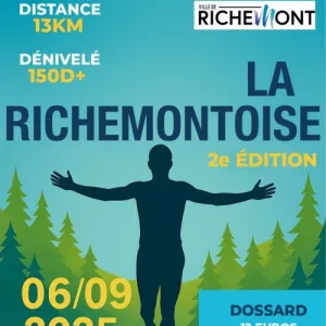 La Richemontoise, une course nature de 13 km, se déroule à Richemont, en Moselle, au cœur du Grand Est. Le parcours, mêlant bitume et sentiers forestiers, offre une immersion dans les paysages enchanteurs de la région, entre forêts verdoyantes et reliefs doux avec 150 m de dénivelé. Ambiance festive et conviviale garantie ! Relevez le défi et venez découvrir la beauté de Richemont en courant !