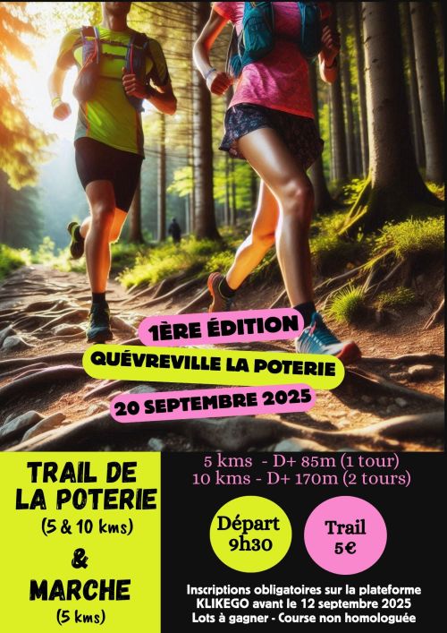 Le Trail de la Poterie, organisé à Quévreville-la-Poterie en Normandie, propose des parcours de 5 et 10 km à travers forêts, chemins et routes communales. Les coureurs découvriront les paysages naturels et le charme du village, avec quelques montées pour pimenter l’expérience. Course conviviale et accessible aux plus de 16 ans, elle invite à allier sport et découverte.