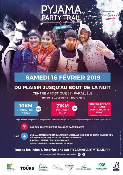 Nous vous donnons rendez-vous une nouvelle fois au Centre Artistique le 37ème Parallèle situé à Tours Nord, tout près du parc de la Cousinerie pour une nouvelle édition de la Pyjama Party Trail ! Deux parcours magnifique vous attendent : le 10Km Découverte pour celles et ceux qui désirent courir en prenant du plaisir tout en s'amusant avec les ami(e)s ou pour les plus performeurs d'entre vous qui souhaitent battre le chrono sur cette distance en mode Trail. Le 21Km Aventure vous réserve quant à lui, un parcours éclectique, mêlant à la fois de la route, des chemins, des traversées en pleine forêt, des côtes, une voie romaine, bref que du bonheur pour les aventuriers et les amoureux de la nature.