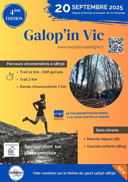 La Galop’In Vic est une course nature à Vic-Fezensac, dans le Gers, au cœur de la Gascogne. Les parcours de 7 et 12 km traversent des chemins de randonnée, offrant des vues sur des paysages boisés et vallonnés. Une marche et une course enfants complètent l’événement. Venez courir et découvrir cette région accueillante !