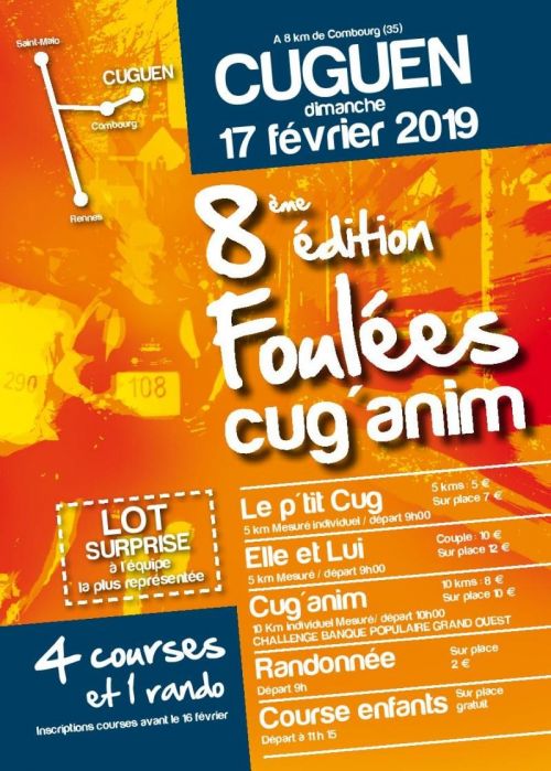 2 boucles de 5 kms sur les routes de campagnes et dans le bourg de Cuguen. Ouvert à tous à partir de cadet (16 ans). Classement au scratch par catégorie. Lot à chaque participant.