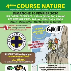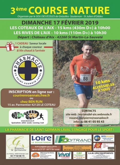 La course « LES RIVES DE L'AIX » est organisée par l'association sou des écoles des communes de GREZOLLES , SOUTERNON et ST JULIEN D'ODES. 1 parcours de 10 kms environ départ à 10h30 et un circuit de 15 kms environ départ à 10h .