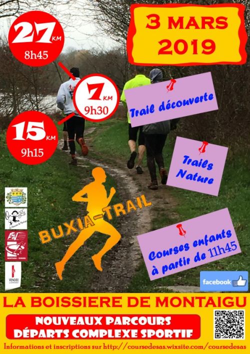 3 trails nature en semi autonomie qui se courre en individuel. Ce sont des épreuves d’environ 27 km, 15km et 7km, qui se dérouleront en une seule étape, au départ du complexe sportif de La Boissière de Montaigu. 3 épreuves dédiées aux enfants : école d’athlétisme, poussins, benjamins et minimes