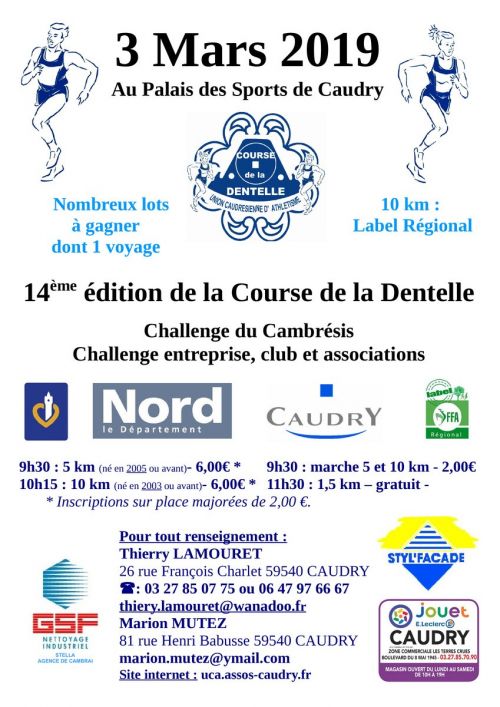 L'Union Caudrésienne d'Athlétisme organise sa traditionnelle course de la Dentelle. Depuis 50 ans, l'Union Caudrésienne d'Athlétisme s'efforce de faire perdurer les traditions, il n'en reste pas moins qu'elle souhaite innover et vous surprendre. Cette année c'est un nouveau parcours modifié qui vous sera proposé, avec un départ sur le Stade Sandras et une arrivée au Palais des Sports « Aurélie Chatelain ». C'est toujours dans une ambiance familiale que nous aurons le plaisir de vous accueillir