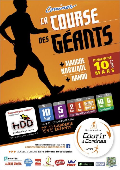 Avant tout une course de "terroir" sympa et conviviale, la Course des Géants est ouverte à tous les amateurs de marche et de course à pied et vous fera découvrir la belle campagne Cominoise. Cette année, nous avons décidé de reverser les bénéfices de la course à l'association HDD (Handicap Droit Devoir) qui prête gratuitement du matériel spécialisé aux personnes handicapées.