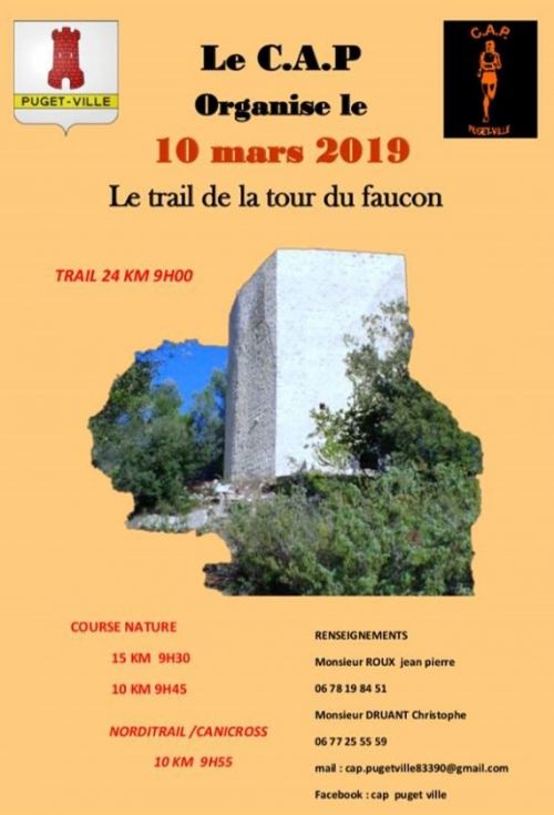 Le club athlétique Pugétois organise la 10 éme édition du trail de la tour du faucon à Puget ville dans le var. Course à pied en zone pierreuse et boisée, ouverte à tous, hommes et femmes, licenciés ou non à partir de 18 ans.