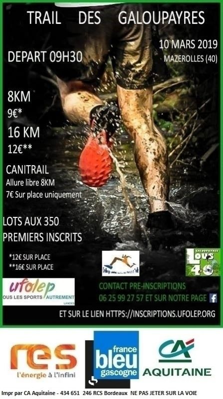 Le Trail des Galoupayres saura toujours vous accueillir et vous faire découvrir la forêt et les coins cachés autour du village de Mazerolles. Les 350 premiers inscrits auront une dotation et les récompenses comme chaque année seront nombreuses (ce qui fait la particularité de cette course depuis toujours).