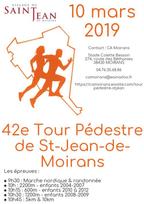 Nous vous proposons 5 courses différentes avec des distances variables en fonction des catégories, ainsi qu'un parcours de Marche nordique et de Randonnée pédestre. Le lieu de rendez-vous pour le Tour Pédestre se situe Place du Champ de Mars à Saint-Jean-de-Moirans.