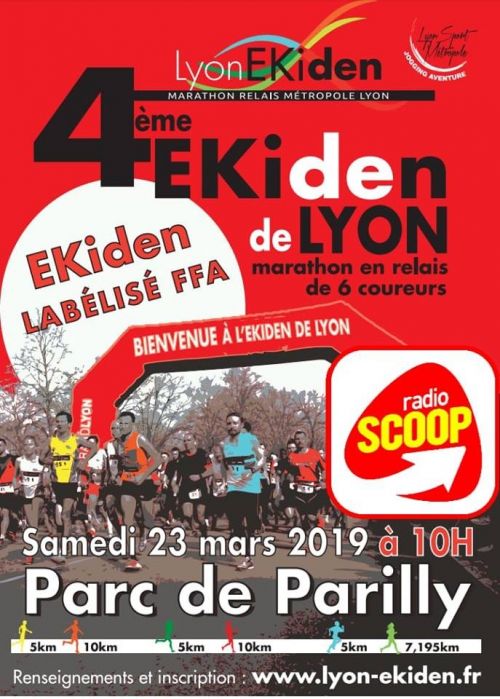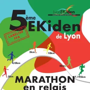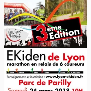 4ème édition de l'Ekiden de Lyon, Marathon Relais Métropole de Lyon qui aura lieu au Stade du RHONE dans le parc de Parilly. Les équipes seront de 6 coureurs et les relais seront les suivants : 5km, 10 km, 5 km, 10 km, 5 km et 7.195 Le parcours est constitué d'une boucle à réaliser une ou deux fois selon les relayeurs. La zone de relais est au même endroit que les lignes de départ et d'arrivée pour plus de convivialité. Pour le relayeur n°6, une petite boucle de 2,195 km est aménagé sur la boucle principale. Il effectue donc une fois la grande boucle puis une fois cette petite boucle.
