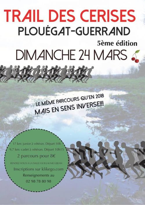 L'Amicale Laïque de l'école, Anthony et Valérie Morin, vous invitent à participer à la 4ème édition du trail des Cerises à Plouégat-Guerrand.
