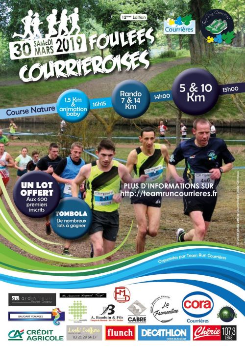 Pour cette 12ème édition des Foulées Courriéroises, la Team Run Courrières, en partenariat avec la ville de Courrières, sera au rendez-vous! Au programme : les traditionnels 5 et 10km, une course pour les enfants et deux randonnées de 7 et 14 km. Le tracé du parcours nature a été revu et simplifié. Les départs des 5 et 10km seront communs. Le 10km se fera donc sur 2 boucles.