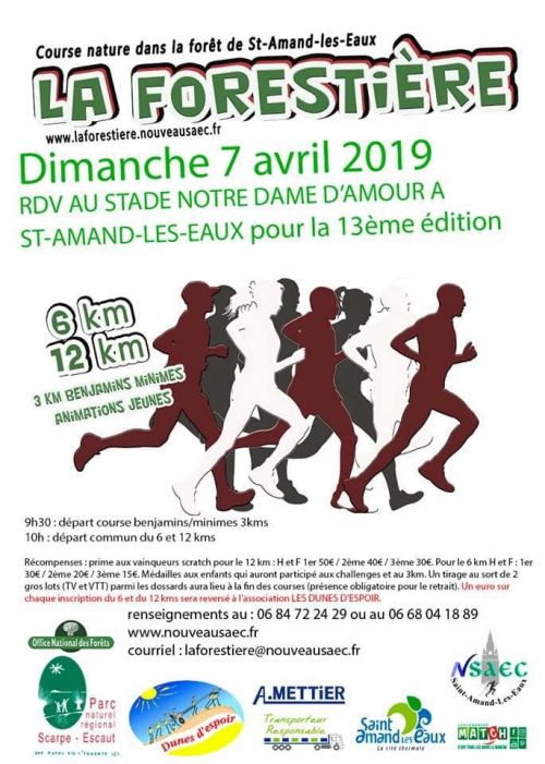Le Nouveau St Amande Etudiant Club organise la Forestière avec le soutien logistique de la ville de St Amand les Eaux. Course de 12 kms en forêt de 2 boucles de 6 kms. Ouverte à toutes et tous pour un moment convivial dans un cadre extraordinaire. Un lot sera remis à chaque participant ainsi qu'une prime scratch sur chaque course. Epreuve ouverte aux handicapé(e)s, Cat. autorisées EA->V5.