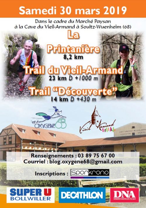 Le Trail du vieil Armand se déroule sur le massif du même nom, haut lieu de la guerre 14/18 le parcours vous fera passer par des vestiges de la guerre (fortins, bunkers, tranchées). La ronde de la tourelle, emprunte des chemins viticoles et un passage en forêt, succession de petites montées, sur le domaine d’Ollwiller, particularité il est possible de concourir en couple, avec l’obligation de passer la ligne d’arrivée ensemble (classement spécifique). Cette année les organisateurs ajoute un trail découverte, non chronométré.