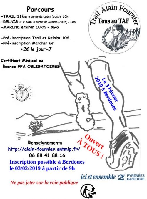 Une course pédestre en nature nommée « Tous au TAF (Trail Alain-Fournier)» est organisée à Berdoues par le Foyer Socio Éducatif du lycée Alain-Fournier de Mirande. Il s’agit d’une course d’environ 11 kms et 370 m de dénivelé positif