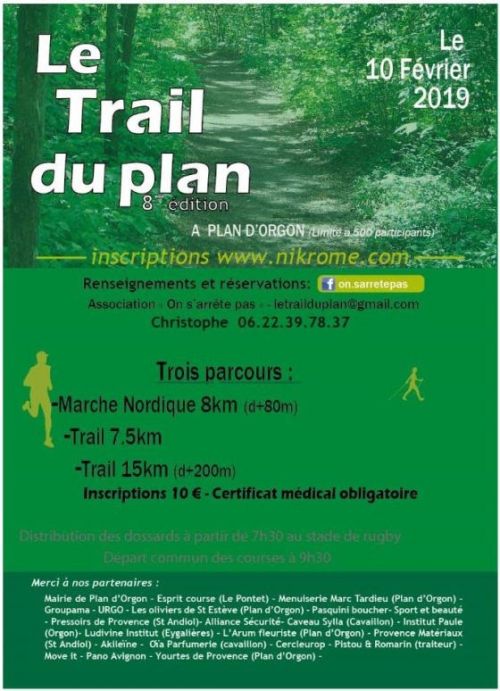 8ème édition du Trail du Plan à Plan d’Orgon (13). Organisé par l’Association »On s’arrête pas », le Trail du Plan propose une marche nordique de 8 kilomètres avec un dénivelé positif de 80 mètres.