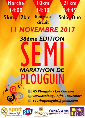 38ème édition du semi-marathon de Plouguin. Le site de départ et d'arrivée sont regroupés devant la salle omnisports pour plus d'ambiance !