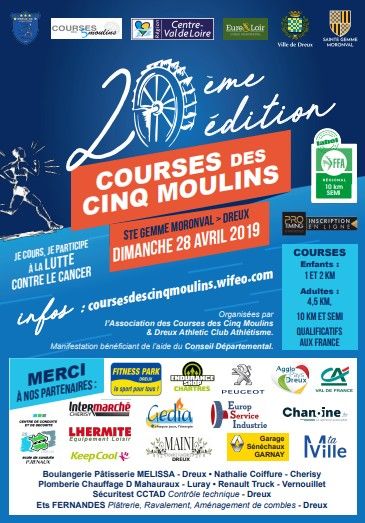 Le 10km et le semi-marathon des cinq moulins offrent un parcours magnifique traverseant 5 communes et longeant les bords de la rivière l'Eure ainsi que d'un vaste plan d'eau. Grâce au 5km, vous pourrez découvrir un parcours agréable (départ de la Maison des Associations). Pour la course enfants, le parcours se compose d'une boucle d'1km sans difficulté à parcourir une ou deux fois selon la catégorie (parcours à proximité de la Maison des Associations).