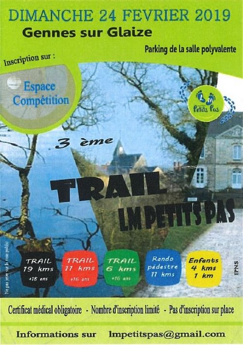 Le Trail LM Petits Pas est un trail nature. Vous parcourez la campagne Gennoise, Longuefuyenne et Ruilléenne. Vous découvrirez sur votre parcours les Chemins pédestres, champs, forêts, Châteaux situés sur ces trois communes. Parce que c'est un trail, vous courrez la quasi-totalité du parcours dans des chemins, des champs, et bien d'autres endroits tenus au secret.
